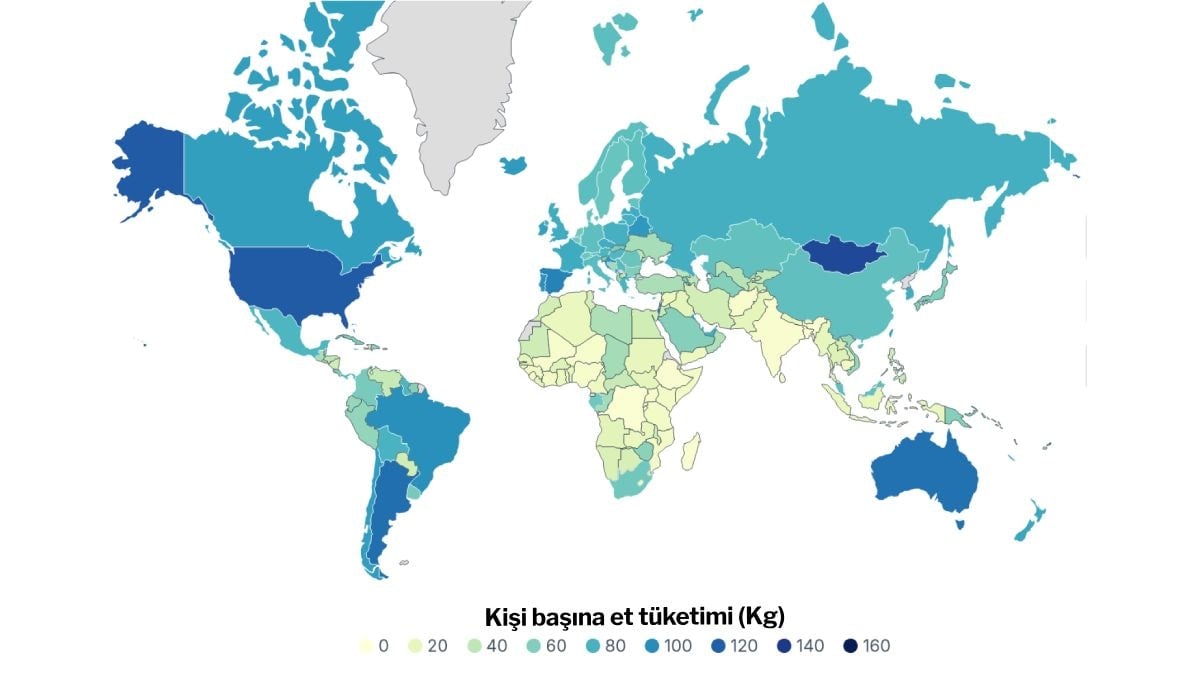 Amerika Birleşik Devletleri, İsrail, Avustralya ve İspanya gibi yüksek nüfuslu ülkeler arasında ise en çok et tüketen ülkelerin başında geliyoruz. İsrail’de kişi başına 113 kilogram, ABD’de ise kişi başına 123 kilogram et düşüyor.