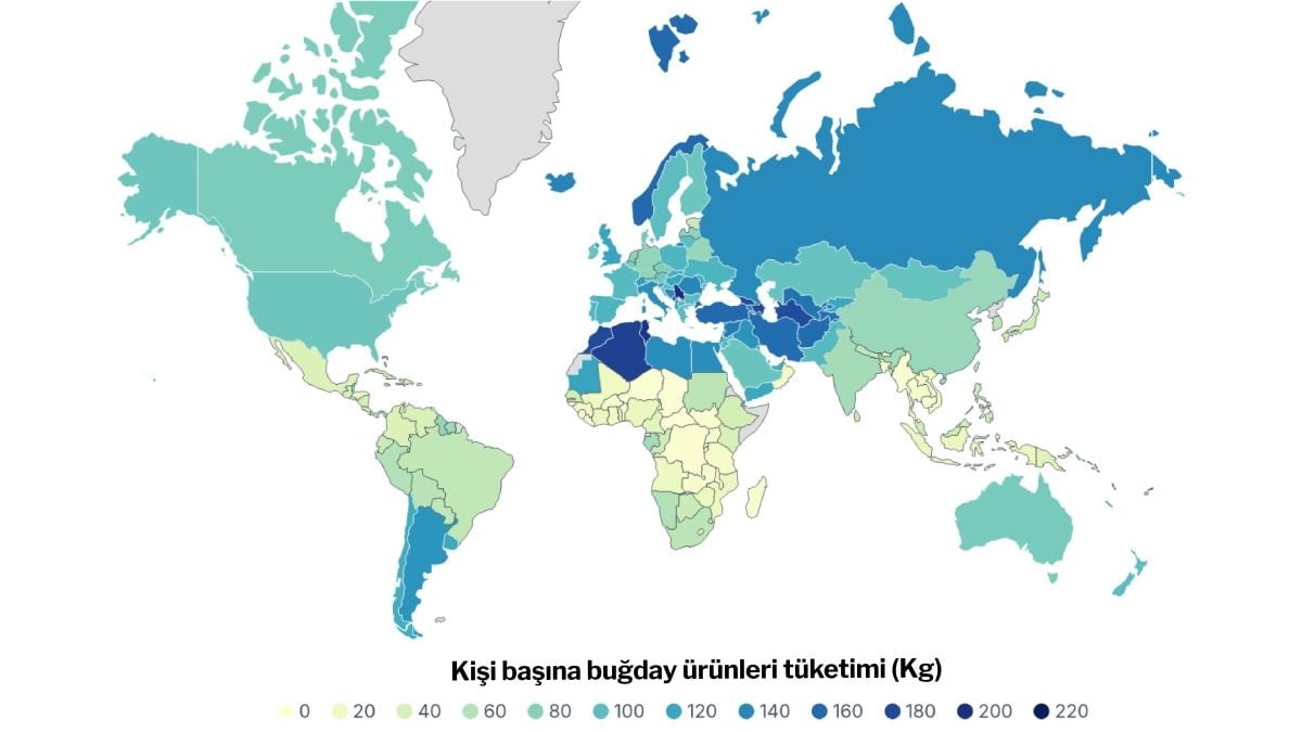 En çok buğdayı tüketen ülkeler arasında ise Sırbistan, Tunus ve Cezayir ilk sıralarda yer alıyor. Sırbistan’da kişi başına 201 kilogram buğday tüketilirken, Tunus’ta 196, Cezayir’de ise 187 kilogram buğday tüketildiği görülüyor.